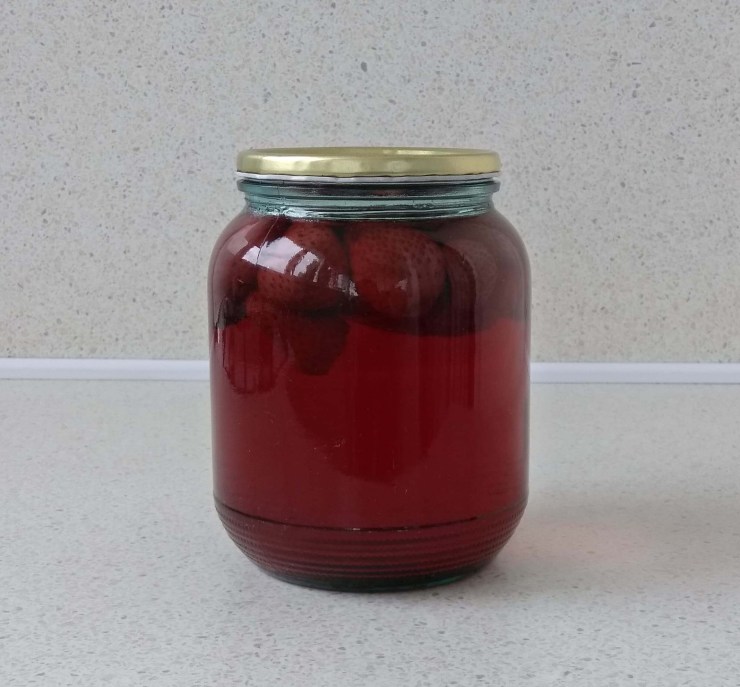 Измивате ягодите и ги поставяте в буркан. Посипвате ги със захар и пълните с вода. Запечатвате буркана и го поставяте в тенджера. Пълните с вода, докато бурканът се покрие. Поставяте тенджерата на котлон. 30 минути след като водата заври, компотът вече е готов. Изваждате го, докато още е горещ. Поставяте го с капачката надолу и чакате, докато бурканът изстине.