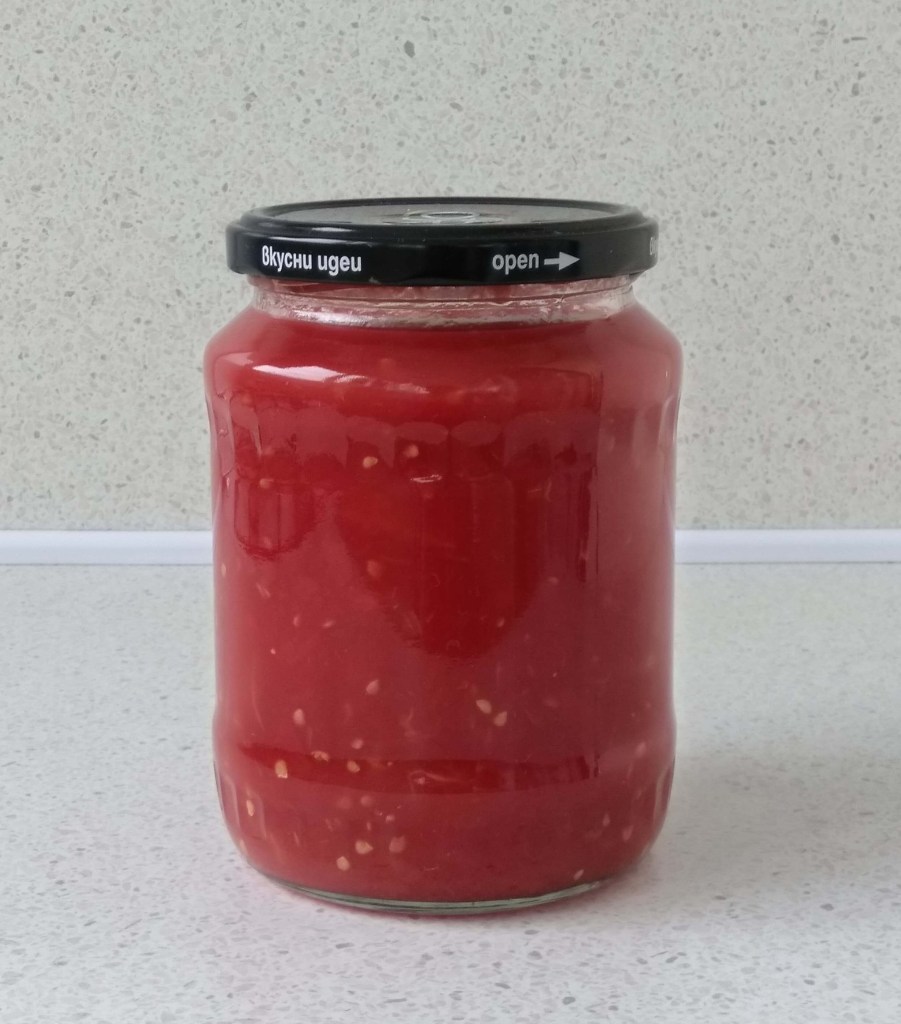 Измивате доматите и ги попарвате. Обелвате им люспите, нарязвате ги и ги посолявате. Сипвате доматите в буркан и ги запечатвате. Поставяте буркана в тенджера и пълните с вода, докато се покрие. Оставяте доматения сок да ври около 20 минути, след което вадите буркана, поставяте го с капачката надолу и чакате да изстине.